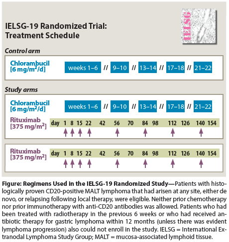 62. Zucca E, Conconi A, Martinelli G, et al. Chlorambucil plus rituximab produces better event-free survival in comparison with chlorambucil alone in the treatment of MALT lymphoma: 5-year analysis of the 2-arms part of the IELSG-19 randomized study. ASH Annual Meeting Abstracts. 2010;116:432.