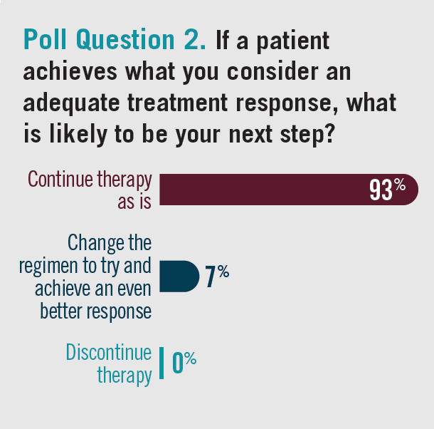 In a polling question, the audience indicated that in a patient who achieved an adequate treatment response, they would continue the therapy as is (poll question 2).