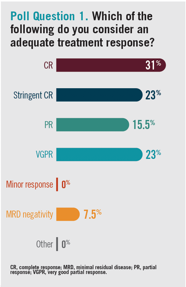 In a polling question, the audience indicated that CR was the greatest indicator of adequate treatment response, followed by either stringent CR or very good partial response and then partial response