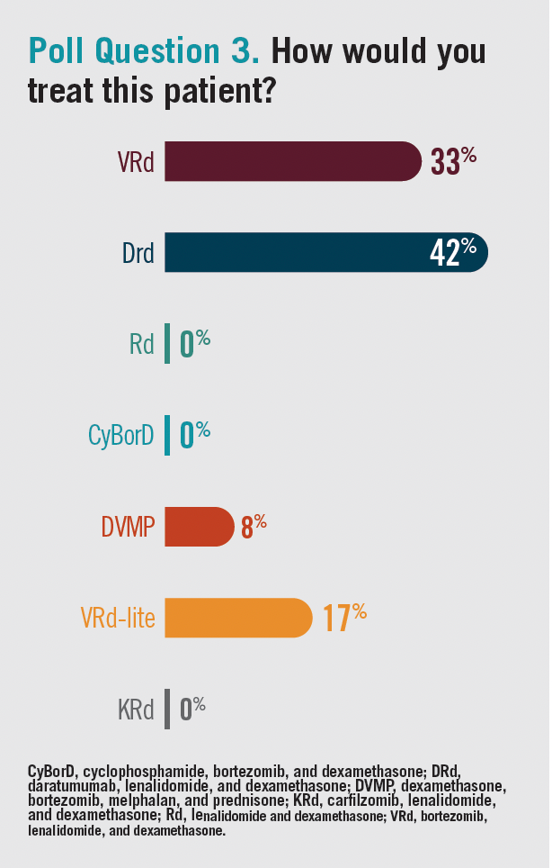 In a polling question, audience members indicated they would favor treating this patient with daratumumab (Darzalex), lenalidomide (Revlimid), and dexamethasone (DRd) (poll question 3).