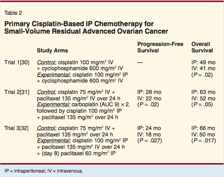 These efforts culminated in three multicenter NCI cooperative group-based randomized phase III trials (Table 2),[30-32] which have unequivocally demonstrated the superiority of intraperitoneal cisplatin compared to intravenous cisplatin, when employed as primary chemotherapy of small-volume residual advanced ovarian cancer (variously defined as the largest residual tumor nodule being < 1-2 cm in maximal diameter following initial cytoreductive surgery).