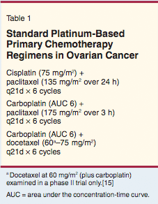 Based on the results of a series of excellent phase III clinical trials, it is appropriate to conclude there are three intravenous platinum-based primary chemotherapy regimens acceptable for use outside the setting of a clinical trial (Table 1).[12-15] As previously noted, the carboplatin-based programs are more likely to be employed in routine practice, not because of superior efficacy, but due to less toxicity and ease of administration (eg, when given with cisplatin, a 24-hour paclitaxel infusion is required to reduce the risk of severe neurotoxicity).[16]
