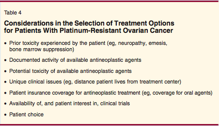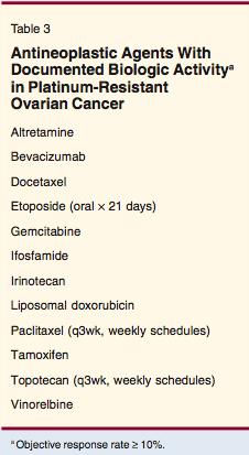 Furthermore, an ever-increasing number of antineoplastic agents have been shown to possess a reasonable degree of "biologic activity" in resistant ovarian cancer (Table 3). In the absence of data from prospective randomized trials revealing the superiority of one drug (or treatment regimen) over another, defining an optimal management paradigm in such patients becomes increasingly difficult. In this clinical setting, the oncologist must continually monitor the status of the patient's disease, the side effects experienced by the individual, and rapidly accumulating data in the peer-reviewed medical literature, to appropriately advise the woman regarding the most reasonable future management approaches (Table 4).