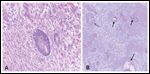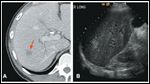 Computed tomography (CT) scan of the abdomen and pelvis revealed a complex cystic mass in the head of the pancreas with ill-defined borders and biliary dilatation. A questionable right hepatic lobe lesion was of concern for metastatic disease (Figures 1A and 2). A right upper quadrant ultrasound demonstrated a 3.5 × 1.8 × 2.5 cm cystic mass in the pancreatic head, and a right liver lobe lesion measuring 1.7 cm (Figure 1B).