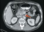 The initial lab workup revealed a CA 19-9 of 83 U/mL (normal, < 37 U/mL) when he was jaundiced, but this value decreased to 33 U/mL after the jaundice resolved. His total bilirubin (7.2 mg/dL), aspartate aminotransferase (175 U/L), alanine aminotransferase (501 U/L), and alkaline phosphatase (422 U/L) were all markedly elevated at presentation. The remainder of his laboratory tests were within normal limits. Endoscopic retrograde cholangiopancreatography (ERCP) was performed and a biliary stent was placed, resulting in the resolution of the patient’s symptoms and normalization of his lab values. Brushings from the ERCP were nondiagnostic.