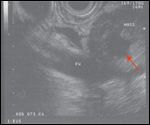 The patient then came to our institution for further management. An endoscopic ultrasound (EUS) visualized a 3.5 × 2.2 cm irregular cystic lobulated mass in the pancreatic head, with clear involvement of the portal vein at the confluence with the superior mesenteric vein (SMV), causing limited occlusion (Figure 3). Fine-needle aspiration (FNA) was performed during EUS and revealed well differentiated pancreatic adenocarcinoma with papillary features. The patient experienced a recrudescence of his presenting symptoms and required repeat ERCP to replace an occluded biliary stent.