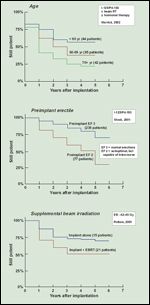 In multivariate analysis, Stock and colleagues reported that pretreatment erectile function was the strongest predictor of posttreatment erectile dysfunction.[5] At 6 years, 70% of patients with normal preimplant erectile function maintained potency, compared with only 34% of patients with preimplant erections considered sufficient for intercourse but suboptimal (Figure 3).[5,6,22] Using the IIEF instrument, Merrick and colleagues also reported that preimplant erectile function was predictive of 6-year potency preservation (50% for normal erections vs 13% for preimplant erections considered suboptimal).[6]