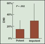 Conflicting results have been reported regarding the relationship between radiation dose and the development of postbrachytherapy erectile dysfunction. Stock and colleagues reported in multivariate analysis that a D90 (the radiation dose delivered to 90% of the prostate gland) greater than 160 Gy for I-125 and a D90 greater than 100 Gy for Pd-103 was predictive of brachytherapy- induced erectile dysfunction.[5] Although significantly different potency preservation rates were reported, the absolute differences were minimal (58% vs 64%, P = .02).