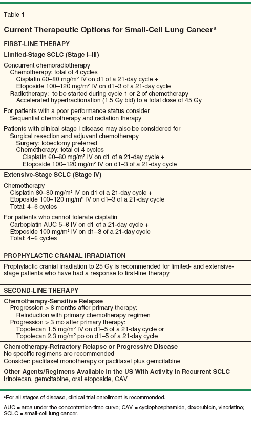 SCLC continues to be almost universally fatal and carries the same poor prognosis as it did 25 to 30 years ago. In the 1980s, the introduction of platinum agents as primary therapy in SCLC resulted in improved response rates and survival duration and, together with improvements in radiation therapy, established the possibility of cure in a minority of patients. A summary of current therapy options is presented in Table 1. Changes in recommended therapy have been incremental at best over the past 3 decades. Topotecan was approved for the second-line treatment of SCLC in 1998. Adjustments in radiotherapy include the use of accelerated hyperfractionated thoracic radiotherapy and the demonstration of clinical benefit for PCI in both LS and ES disease.