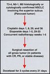 This led to a phase II study, SWOG 9416 (intergroup trial 0160), which again evaluated this approach in the setting of superior sulcus tumors.[18] In this trial, 111 patients with mediastinoscopy-negative T3-4, N0-1 superior sulcus NSCLC were treated with preoperative chemotherapy (two cycles of cisplatin, 50 mg/m2 on days 1, 8, 29, and 36, and etoposide, 50 mg/m2 on days 1, 8, 29, and 36) given concurrently with thoracic radiotherapy to 45 Gy, followed by surgery and then two further cycles of chemotherapy with cisplatin and etoposide. Eighty-three patients (75%) underwent thoracotomies, of which 76 (92%) had complete (R0) resections and 28 (34%) had a complete pathologic response. The 2-year survival was 55% for all patients and 70% for patients who had an R0 resection.