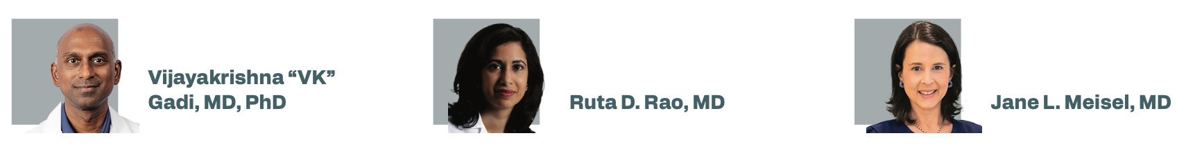 Vijayakrishna “VK” Gadi, MD, PhD, a professor and director of medical oncology at the University of Illinois College of Medicine Chicago and deputy director at the University of Illinois Cancer Center, led the panel. He was joined by Ruta D. Rao, MD, a professor in the Department of Internal Medicine, director of the Coleman Foundation Comprehensive Breast Cancer Clinic, and medical director of RUSH University Cancer Center; and Jane L. Meisel, MD, a professor in the Department of Hematology and Medical Oncology and Department of Gynecology & Obstetrics, and codirector of breast medical oncology at Emory University School of Medicine.