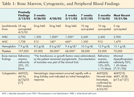 As a part of his evaluation he had a bone marrow biopsy, aspirate, and cytogenetics, which revealed myelodysplastic syndromes (MDS), refractory anemia, cellularity of 20%, 2% blasts, with anemia (hemoglobin 8.8 g/dL, MCV 119), and leukopenia (WBC 2,000, neutrophils 61%). Cytogenetics confirmed the presence of a solitary cytogenetic abnormality, deletion 5 q, a favorable prognostic finding in MDS. The final IPSS (International Prostate Symptom Score) was zero, indicating low-risk disease. No FDA-approved therapies were available in 2001 and the patient was enrolled in a clinical trial with a matrix metalloproteinase inhibitor, prinomastat. His transfusion requirements did not improve and he experienced treatment-related severe joint pain. He modified his work schedule to limit travel and had considered retirement due to his symptoms and concern that no treatment would be effective. Transfusion support was continued with increasing frequency.