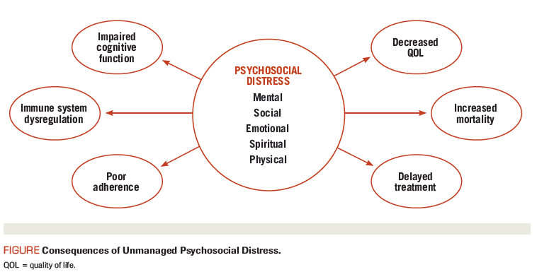 Psychosocial distress is associated with depression in cancer patients, which is considered a comorbid condition.[3,4] Depression is one symptom of psychosocial distress that has been linked specifically to increased mortality in cancer patients.[5] Of note, cancer patients with preexisting emotional problems or physical limitations have increased mortality compared with patients who develop these problems after diagnosis.[6] The data are still inconclusive as to whether untreated clinical depression increases the risk of cancer progression.[5,7] Cancer progression, however, raises the risk of clinical depression, with a prevalence greater than the general population.[8] Cancer patients with psychosocial distress may experience mental, emotional, social, physical, and/or spiritual problems.[9] Research has found that if distress is not detected and is left unmanaged, unintended consequences to quality and quantity of life may occur.[3] These consequences include increased mortality rates, delayed time to treatment, poor adherence to treatment, and dysregulation of the immune system (see Figure).[2,10-14]