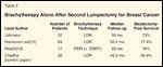 Experience using low–dose-rate brachytherapy as a reirradiation modality has been reported in a combined experience from Hannoun-Levi at the Marseille and Nice Cancer Institute including 69 patients (Table 2).[12] In this study, patients treated with second lumpectomy and low–dose-rate interstitial brachytherapy represented only a select 14.6% of all local failures. Patients treated at Nice received 30 Gy, whereas 45 to 50 Gy was delivered to all patients treated at Marseille. The investigators observed an association between brachytherapy dose and toxicity. The incidence of grade 2/3 complications was 0%, 28%, and 32% with brachytherapy doses of 30 Gy, 45 to 46 Gy, and 50 Gy, respectively (P = .01). The 5-year overall survival rate was 91.8%, and the 5-year freedom from second local recurrence and disease-free-survival rates were 77.4% and 68.9%, respectively. On multivariate analysis, factors associated with a higher overall survival included absence of axillary lymph node metastases at initial presentation, time interval between initial and in-breast cancer, and the site of relapse in a quadrant other than that of the initial primary cancer. Also, patients treated with a fewer number of interstitial catheters and who received lower brachytherapy doses were at a higher risk for local failure.