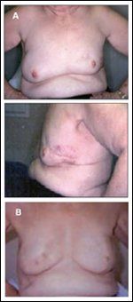 Cosmetic result at 36 months’ (left) and at 74 months’ (right) follow-up.In February 2003, on self-exam the woman palpated an approximately 1-cm freely mobile mass in the lower outer quadrant of the right breast. Pathology confirmed a 1.5-cm poorly differentiated infiltrating duct cell cancer. The workup included a bilateral MRI that reported no additional lesions.