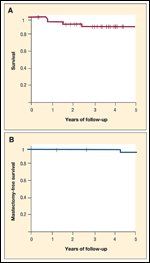 The combined experience from Allegheny General Hospital[10] and Beth Israel Medical Center[9] includes 38 patients treated with second lumpectomy and partial-breast reirradiation with interstitial low–dose-rate brachytherapy to a dose of 45–55 Gy (Figure 1). The investigators reported the following median results: Time from initial primary to in-breast recurrence was 11.5 years; age at diagnosis of the in-breast cancer was 61 years; tumor size was 1 cm; and follow-up after salvage brachytherapy was 45.5 months. The 5-year actuarial overall survival rate after salvage brachytherapy was 87.9% (95% confidence interval [CI] = 77.4%–99.8%; Figure 2A). The 5-year mastectomy-free survival rate was 94.4% (95% CI = 95.5–100; Figure 2B).