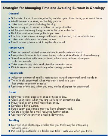 Insufficient time is a major source of stress and burnout in the practice of oncology, but oncologists can use a variety of strategies to increase their efficiency and get more satisfaction from their work and from life