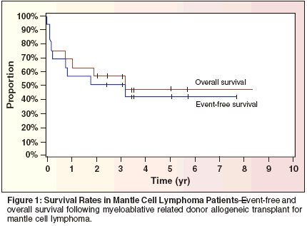 Because conventional chemotherapy is not thought to be curative in most patients with MCL, high-dose chemotherapy followed by stem cell transplant has been evaluated in an effort to improve survival rates. No prospective randomized study comparing conventional therapy with highdose chemotherapy followed by stem cell transplant has yet been published. However, several phase II trials of stem cell transplant in MCL patients have been published. Most of these studies demonstrated that patients are more likely to benefit from this approach if the transplant is performed earlier in the course of the disease (ie, first complete response).[14] Improvements in this approach include better induction chemotherapy, such as rituximab/hyperCVAD, and the addition of other agents to modify the transplant regimen, such as rituximab for in vivo purging[15] or radioimmunotherapy with tositumomab/ iodine-131 tositumomab (Bexxar) or ibritumomab tiuxetan (Zevalin).[16-18] However, as the authors point out, autologous stem cell transplant may only improve the response rate and time to treatment failure without achieving cure. An alternative to this approach, which was not discussed extensively in the article, is the use of high-dose chemoradiotherapy and an allogeneic stem cell transplant. Such a protocol was evaluated in a selected population of young MCL patients.[ 19,20] At the University of Nebraska Medical Center, we performed transplants in 20 MCL patients using a fully myeloablative regimen with a related allogeneic donor; 45% of patients are alive and disease-free between 1 and 9 years posttransplant (Figure 1). However, allogeneic stem cell transplant has a limited role in MCL, as most patients with this disease are over 60 years old. The toxicity of allogeneic transplant could be reduced by using nonmyeloablative regimens. Immunotherapy