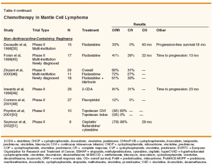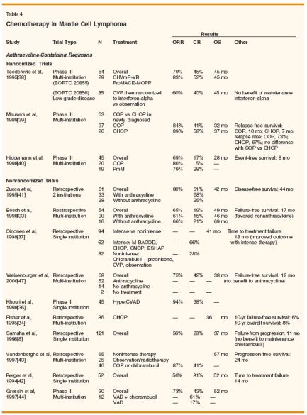 Since MCL was first recognized as a separate disease entity, response rates and overall survival have been noted to be poor. Fisher et al reported the results of a Southwest Oncology Group study designed to determine the natural history of patients with MCL and marginal zone lymphoma treated with the CHOP regimen (cyclophosphamide [Cytoxan, Neosar], doxorubicin HCl, vincristine [Oncovin], prednisone) between 1972 and 1983.[34] The failure-free survival was significantly shorter for the 36 MCL patients compared to the 348 remaining patients. The 10-year failure- free survival estimate for MCL patients was only 6%, compared to 25% for patients with other indolent lymphomas. Multiple chemotherapeutic regimens have been tested, but none has demonstrated a clear superiority (Table 4).[33-61] Reported overall response rates range from 30% to 90%, and complete response rates, from 10% to 90%.[35-38] Despite large differences in reported overall response rates, overall survival has remained essentially the same across many of the studies (range: 24 to 60 months).[4,8,33-46]