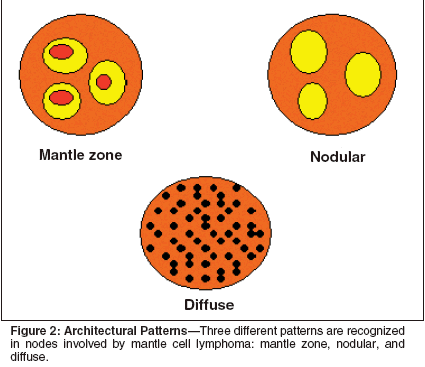 diffuse (Figure 2). The mantle zone pattern (3%-26% of cases) resembles a normal node with expansion of the mantle zone with malignant cells. This pattern is considered a low-grade subtype of MCL. The nodular pattern (13%-39% of cases) has ill-defined follicle-like nodules with neoplastic cells blending with the nonneoplastic cells, and germinal centers are absent. The diffuse pattern (28%-78% of cases) is composed of small neoplastic