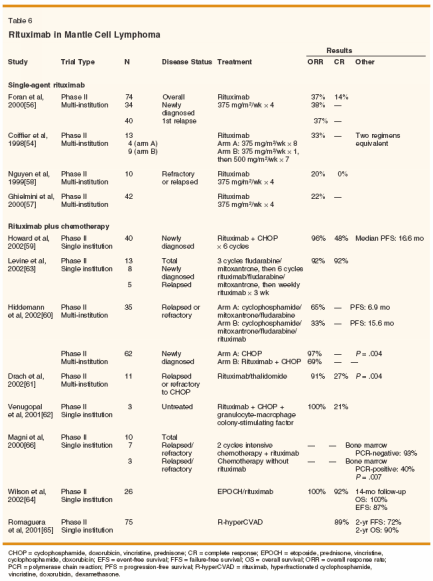 Rituximab (Rituxan), the chimeric murine/human monoclonal antibody to CD20, has been used in an increasing number of indications since it was approved by the US Food and Drug Administration in 1997 for relapsed and refractory follicular and low-grade lymphomas (Table 6).[54-68] Response rates to single-agent rituximab in B-cell lymphomas vary in the literature from 10% to 38%.[54-58] In 1998, Coiffier et al published data on the use of rituximab in 54 patients with relapsed or refractory aggressive lymphomas, including 12 MCL patients.[54] Single-agent rituximab administered at a dose of 375 mg/m2/wk * 8 weeks or 1 dose at 375 mg/m2 followed by 500 mg/m2/wk * 7 weeks resulted in a 33% response rate.