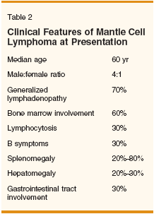 MCL is diagnosed at a median age of 60 years, with a male-to-female ratio of 4:1 (Table 2). Patients usually present with advanced disease. Approximately 60% of patients fall into the intermediate-prognostic group (International Prognostic Index 2/3). The incidence of generalized lymphadenopathy is about 70%, and of B symptoms, 30%. Lactate dehydrogenase and beta-2-microglobulin levels are elevated in about 50% of patients. Bone marrow involvement is common and occurs in about 60% of patients, irrespective of peripheral blood involvement. Lymphocytosis and peripheral blood involvement occurs in 30% of cases, and extranodal involvement in more than one site, in about 10% of patients. The most common sites of extranodal involvement are the spleen, liver, and gastrointestinal tract. Extensive lymphomatous polyposis involvement of the bowel can occur, although nonmacroscopic involvement is more common. Central nervous system involvement is more common in blastoid MCL.[4,24-26] Prognostic Factors and Outcome