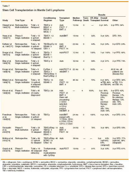 Due to the improved survival seen in patients treated with stem cell transplant in other NHLs, this treatment modality has been applied to MCL (Table 7).[36,69-79] The majority of the data derive from small nonrandomized studies using various conditioning regimens (total-body irradiation [TBI], TBI/chemotherapy, or chemotherapy alone) and various stem cell purging protocols.[68-73]