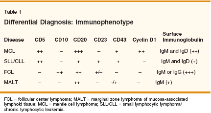 MCL has been confused with other lymphomas due to morphologic similarities (Table 1). Nodular MCL with residual germinal centers may be morphologically similar to follicular lymphomas. However, follicular lymphomas are usually CD5-negative, CD43-negative, Bcl-6-positive, and CD10-positive, whereas MCL is the opposite. Both MCL and marginal zone lymphomas have a tendency to involve the gastrointestinal tract and bone marrow. Marginal zone lymphomas are usually CD5-negative and cyclin D1-negative. Small lymphocytic