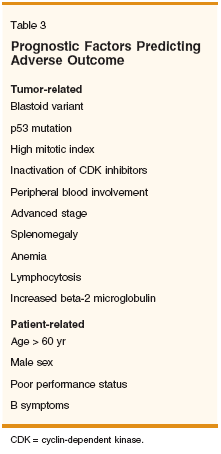 Tumor-associated prognostic features are mainly related to the morphologic pattern (Table 3). The mantle zone variant has an indolent behavior similar to that of low-grade lymphomas, while the blastoid variant has an aggressive clinical behavior.[25,27] High mitotic index and elevated Ki- 67 index have also been correlated with poor outcome.[27-29] Peripheral blood involvement at diagnosis predicts poor outcome, whereas bone marrow involvement does not.[10] In one small study, no difference in survival was seen between patients with t(11;14) and those with no detected translocation.[27] Mutations in p53 and abnormalities in the CDK inhibitors p16 and p21 are usually associated with aggressive MCL.[30,31] Mutated VH genes and low CD38 expression are described in a subset of mantle cell lymphoma with an indolent course.[32] Older age, male sex, poor performance status, B symptoms, advanced disease at presentation, lymphocytosis, elevated beta-2-microglobulin, and splenomegaly are also poor prognostic factors.[33] TreatmentChemotherapy