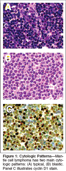 ABSTRACT: Mantle cell lymphoma (MCL) accounts for approximately 6% of non-Hodgkin’s lymphomas. Patients usually present with advanced disease, with a tendency for extranodal involvement. MCL is an aggressive lymphoma with moderate chemosensitivity, but it remains one of the most difficult therapeutic challenges. Complete response rates to chemotherapy range from 20% to 40%, with median survivals of 2½ to 3 years. Anthracycline-containing regimens do not prolong survival compared with nonanthracycline regimens. Single-agent rituximab (Rituxan) has produced response rates of about 30%, and when combined with an anthracycline-containing regimen, response rates increase to above 90%; however, an impact on survival has not yet been demonstrated. More intensive regimens such as hyperCVAD (hyperfractionated cyclophosphamide [Cytoxan, Neosar], vincristine, doxorubicin [Adriamycin], dexamethasone, methotrexate, cytarabine) with either stem cell transplant or rituximab have been associated with promising results.