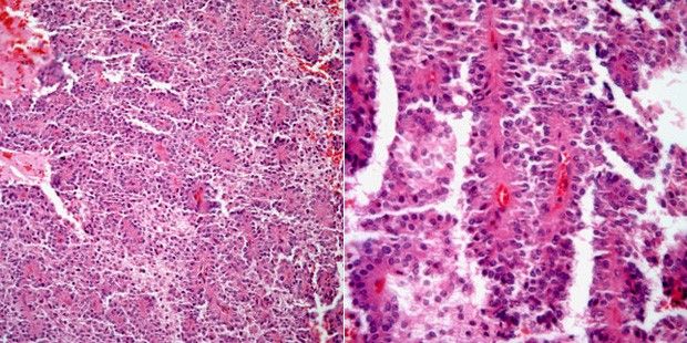 A 28-year-old woman presented with symptoms of abdominal pain, dyspepsia, and nausea. At physical examination, an abdominal mass was palpated. Radiological evaluation showed the presence of a mass in the pancreas. Resection of the mass was performed.