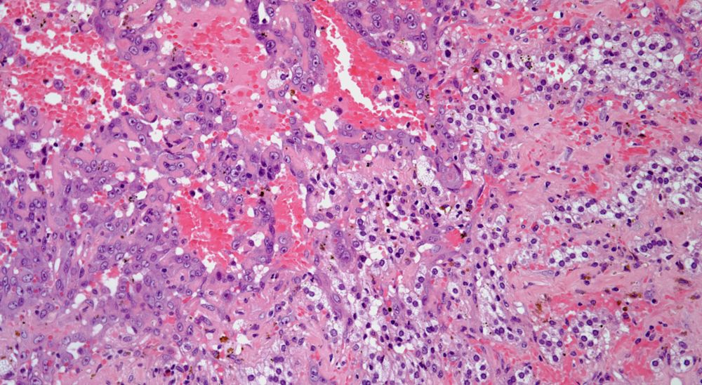 A 52-year-old man presents with a mass in his right adrenal gland, and a biopsy is performed.