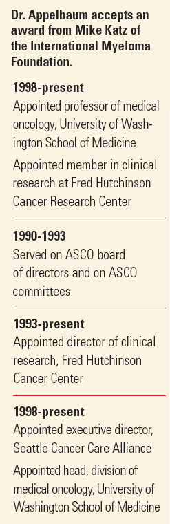 As an assistant professor at the Hutchinson center, Dr. Appelbaum spent his fi rst two months as a fellow in the transplant service, taking care of patients and using the knowledge he gained in autologous transplantation at the NIH to set up some clinical trials at Hutchinson.