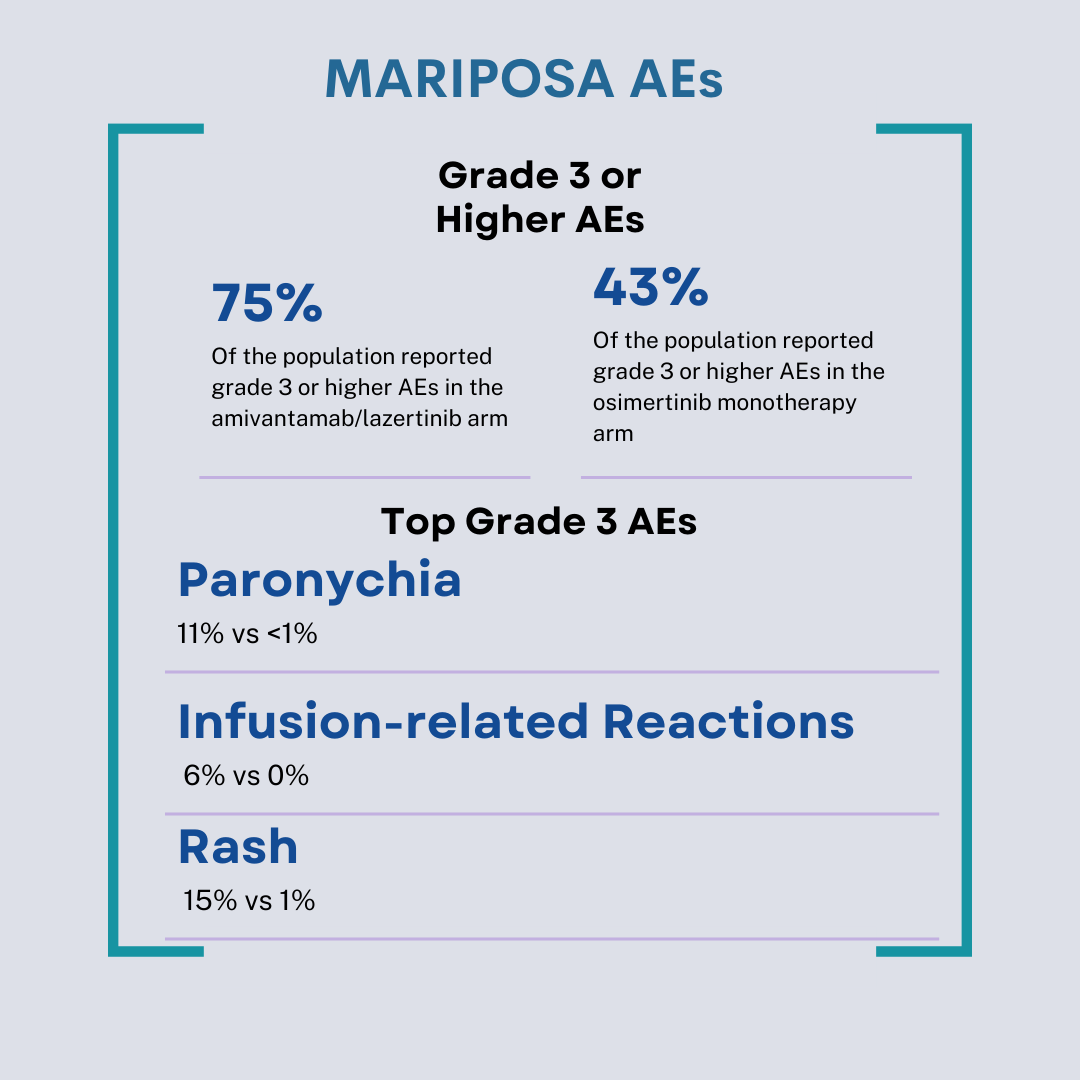 Dimou: The efficacy data look very similar to the phase 3 FLAURA2 [NCT04035486], but certainly the toxicity is different, not necessarily better or worse, but different.4 We get more cytopenias with the FLAURA2 and more EGFR and MET-related toxicity with the MARIPOSA regimen. In my experience, the use of amivantamab is difficult when we use it in the second line as part of the phase 3 MARIPOSA-2 [NCT04988295] regimen with chemotherapy and amivantamab.5 It’s also heavy in terms of the required supportive care, which is important for those patients who have to address those AEs with a whole bag of drugs. It’s not like we’re giving them 1 or 2 antineoplastics. We’re giving them supportive treatment, which can be overwhelming. I don’t have a lot of experience with the amivantamab plus lazertinib regimen yet, but in general, the chemotherapy plus osimertinib [regimen] would be easier, has less visits to the office or to the infusion center, and less supportive care that is required. The effectiveness appears to be the same. I don’t see the reason why we would prioritize the MARIPOSA regimen. I don’t know what my colleagues think.