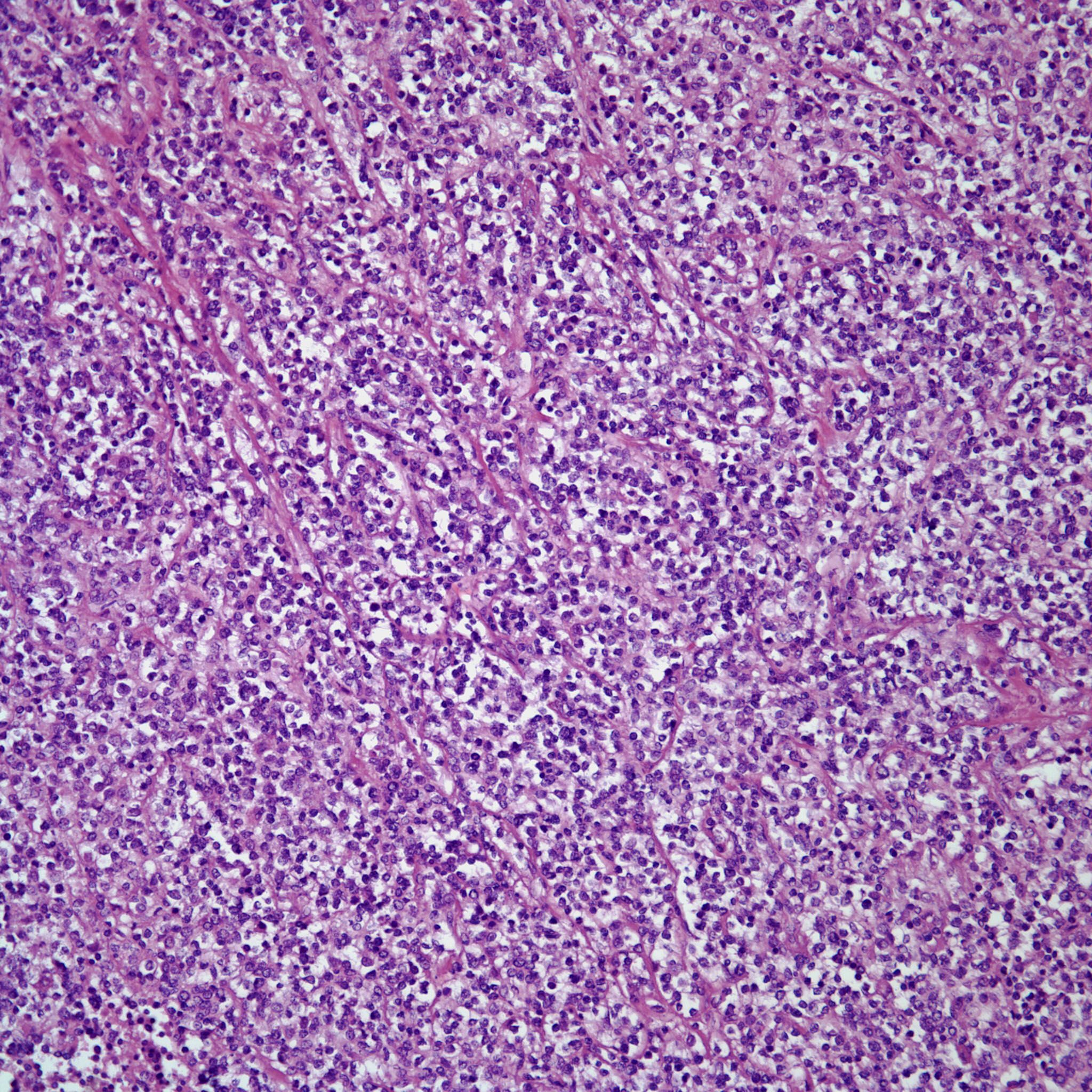 A 27-year-old woman presents with symptoms of chest pain, cough, and general malaise. The patient does not have any other pertinent medical history. Diagnostic imaging reveals an anterior mediastinal mass. Surgical biopsy is performed.