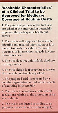 The agency said that studies other than those deemed automatically covered would receive Medicare coverage for routine care if they meet criteria to be established by a federal interagency group. Principal investigators will certify that their trials meet the criteria, which will be based on seven desirable characteristics of a clinical trial listed by HCFA (see Table).