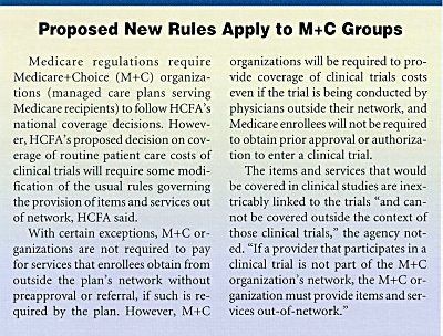 WASHINGTONUnder proposed new Medicare rules, routine care costs for beneficiaries participating in clinical trials funded by a number of federal agencies would be automatically covered. Trials conducted under investigational new drug applications (INDs) or that are exempt from an IND would also receive automatic coverage status. Other trials that meet eligibility requirements (to be established) would also be covered.