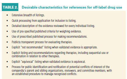 In March 2007, CMS convened its Medicare Evidence Development and Coverage Advisory Committee (MedCAC) to develop “desirable characteristics” for the regular inclusion of additional compendia (see Table 2). By 2008, CMS had added three new compendia to its list of designated review publications: the National Comprehensive Cancer Network Drugs & Biologics Compendium, DrugDex, and Clinical Pharmacology.