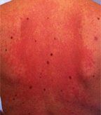 A grade 3 maculopapular rash associated with vemurafenib following ipilimumab induction for metastatic melanoma. Adapted from Figure 1, Harding et al. Hypersensitivity Skin Reactions in Melanoma Patients Treated With Vemurafenib After Ipilimumab. ASCO Annual Meeting, 6/2/2012.
