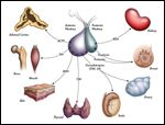 Damage to the pituitary and hypothalamus can occur from tumor extension or compression, during surgical resection or secondary to radiation therapy. The consequences of such damage are devastating. Figure 1 illustrates the many pituitary hormones and their diverse functions on target organs. These hormones promote body growth, protein synthesis, and fertility. They regulate glucose metabolism, cortisol/thyroid hormone production, and urine output.