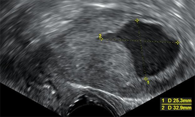 Transvaginal ultrasonography showing uterine fluid accumulation. Biopsy showed endometrioid adenocarcinoma.