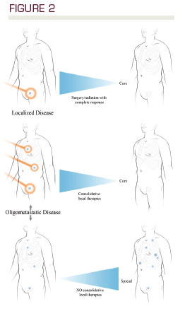 In their editorial “Oligometastases,” Hellman and Weichselbaum[7] discuss the opposing hypotheses of cancer metastasis as well-ordered and predictable based on knowable anatomic and physiologic data or, alternatively, as the manifestation of cancer as a systemic disease with widespread, initially undetectable micrometastases present at the time of diagnosis but maturing to clinical relevance over time; ultimately they propose that our understanding of cancer behavior is most consistent with a continuum spanning these extremes and with many intermediate states. Their formulation of a “clinical significant state of oligometastases” describes a point on this continuum where metastatic disease is present but potentially curable through consolidation of both the primary tumor and all metastases with local therapies (see Figure 1).