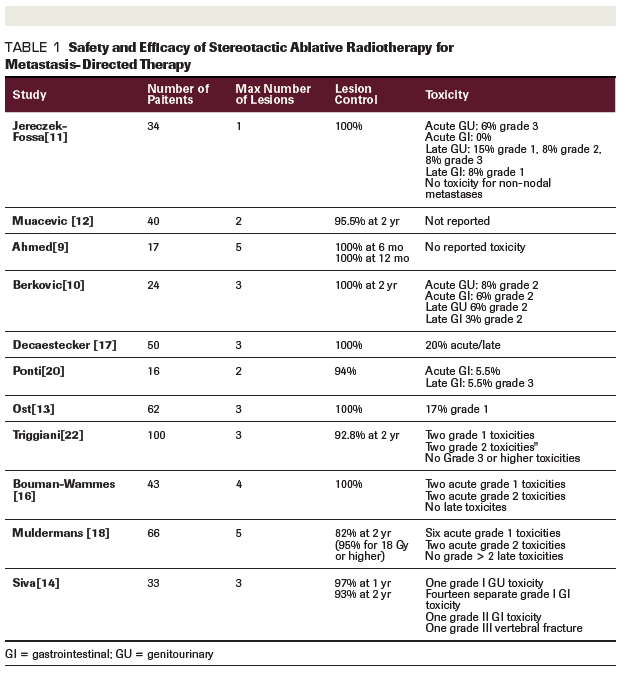 TABLE 1: Safety and Efficacy of Stereotactic Ablative Radiotherapy for Metastasis-Directed Therapy