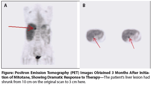 A positron emission tomography (PET)/CT scan performed 3 months after the initiation of mitotane therapy demonstrated that the liver lesion had decreased to 3 cm (Figure). A PET/CT scan 1 year after mitotane had been started showed resolution of all pulmonary nodules and a stable 3-cm liver lesion. Nearly 2 years after the original surgery, laparoscopic radiofrequency ablation was performed to address the persistent hepatic lesion. Mitotane was discontinued 3 years after initiation, given the absence of residual disease on scans. After a nearly 2-year hiatus from mitotane, repeat imaging showed an isolated 1-cm pulmonary lesion in the right upper lobe. A wedge resection was performed; pathologic examination confirmed this lesion to be recurrent adrenocortical carcinoma. Therapy with mitotane was resumed and again dosed to maximum tolerability.