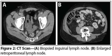 While on periodic surveillance with physical exams and imaging, a 1.2-cm right inguinal lymph node and a 1-cm left para-aortic lymph node were discovered on a CT scan 2 years after initial presentation. For unknown reasons, no action was taken immediately, but a follow-up CT scan 3 months later demonstrated an increase in the size of the inguinal and para-aortic nodes (Figure 2). This prompted percutaneous biopsy of the inguinal node, which was consistent with metastatic LCT (Figure 1B). At this time the patient’s serum testosterone was rechecked and was 835 ng/dL, despite his monorchid status and his age of 72 years.