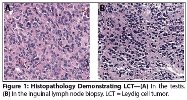 The Case:A 70-year-old, otherwise healthy man presented to his primary care provider for an annual checkup, at which time a nontender right testicular mass was noted. He denied any symptoms, and his serum alpha-fetoprotein and beta-human chorionic gonadotropin levels were normal. A right radical inguinal orchiectomy was subsequently performed. The pathology report demonstrated a 2.1-cm lesion consistent with a Leydig cell tumor (LCT), which was noted to have moderate mitotic activity (4–5 mitoses per high-power field [HPF]), as well as invasion of the spermatic cord (pT3) (Figure 1A). Of note, no lymphovascular invasion (LVI), cellular atypia, or tumor necrosis was identified. Staging CT scans of his chest, retroperitoneum, and pelvis were negative. Given the LCT histology, further testing was done, and per the report, there was no elevation of serum testosterone or inhibin levels at that time. Pertinently, the patient had no symptoms of virilization or feminization. In summary, the patient’s tumor was determined to be a clinical stage IB testicular LCT.