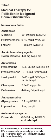 Options for management of malignant bowel obstruction include medical therapy, surgical bypass or excision of the obstruction, intraluminal stenting, and, occasionally, localized radiation therapy. All of these options must be considered in light of the patient's age and overall medical status. For example, if the patient has received a number of therapies and the recurrence is very proximal, it may be that a decompressing gastrostomy is the only reasonable choice. In properly chosen patients, this may be just as successful at palliating symptoms with fewer complications and may offer the patient equal quality of life and survival when compared to open surgical procedures such as intestinal bypass or ostomy formation.[43] Placement of a gastrostomy tube can occasionally be accompanied by a liquid diet. In the obstructed patient who has been documented to have a very slowly progressive tumor that is not causing other symptoms, the use of home parenteral nutrition may be appropriate.