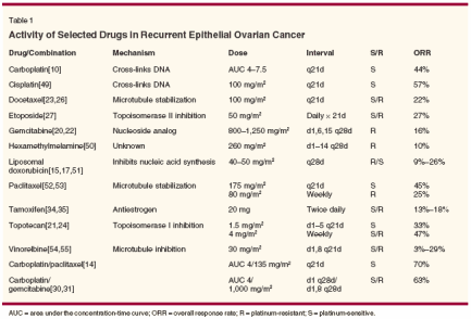 Today, many options exist for the treatment of recurrent ovarian cancer. Although platinum and paclitaxel remain the standards for primary therapy for ovarian cancer in the United States, many other compounds have been shown to possess activity against the disease. A selected list of these compounds can be found in Table 1.[10,15-34] When considering which of these agents to use when platinum and/or paclitaxel has been used as first-, second-, or even thirdline chemotherapy, we tend to balance the chances of a good response with the possibility of new or additive toxicities. Additionally, many of the trials referred to in Table 1 had a significant number of patients who exhibited stable disease as their best response to therapy. The goal of disease stabilization with limited toxicity may be a reasonable approach in certain patients who have minimal symptoms from their disease.