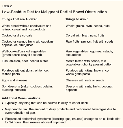 As a rule, ovarian cancer tends to recur in the abdomen. Patients with recurrence in the abdomen may present similar to patients with primary disease, with abdominal aching and symptoms of increased gas, bloating, or nausea. When these signs initially appear, we usually first place the patient on a low-residue diet (Table 2) to try to forestall any obstructive symptoms. This approach often allows us to initiate the next course of chemotherapy, frequently producing enough of a response to avoid complete obstruction. The initiation of a low-residue diet also puts a degree of control back in the patient's hands, as she learns what she can do to prevent a more complete obstruction.