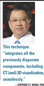 Dr. Wong said that his technique "integrates all the previously disparate components, including CT, optical microendoscopy, electromagnetic (EM) tracking, RFA, real-time segmentation, and 3D visualization, seamlessly to produce clinically relevant results for image-guided intervention of peripheral lung cancer." A fiberoptic probe with an attached camera, guided by EM tracking and preoperative volumetric CT imaging, provides real-time images of the lesions.